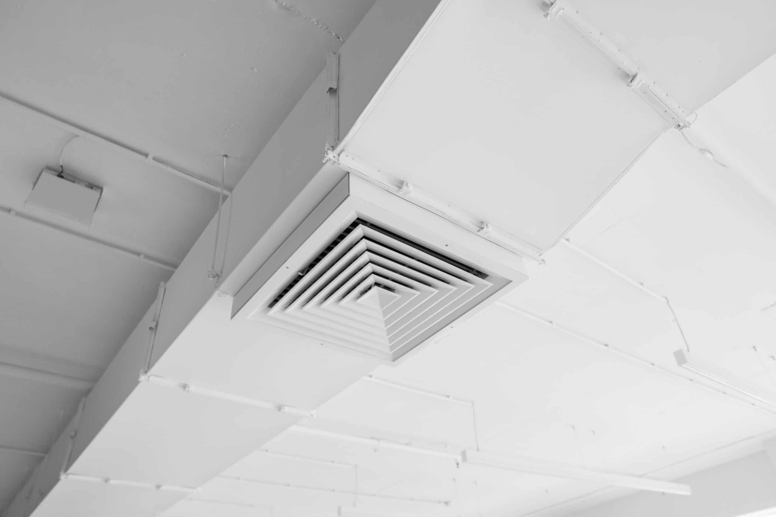 Ventilation system on the ceiling of large buildings. Ventilation pipes in silver insulation material hanging from the ceiling inside new building.