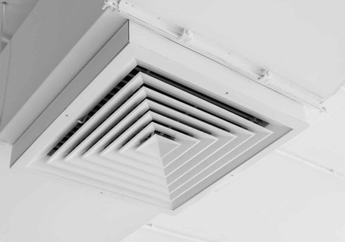 Ventilation system on the ceiling of large buildings. Ventilation pipes in silver insulation material hanging from the ceiling inside new building.